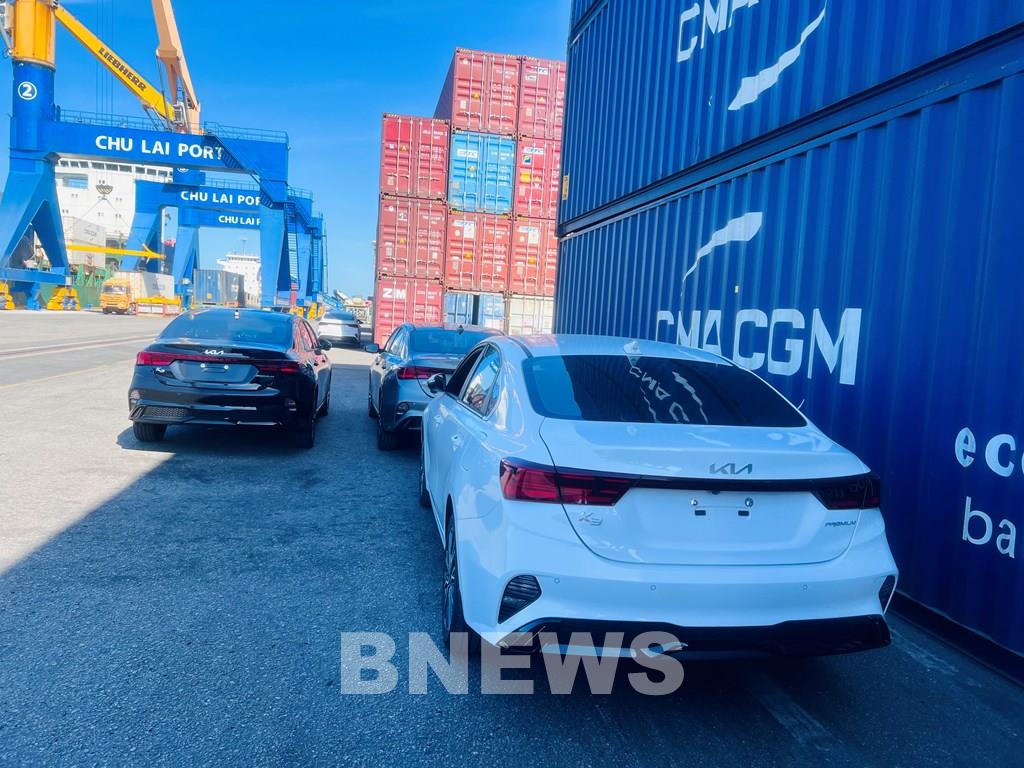 Xe ô tô của nhà máy Thaco Trường Hải đang được tập kết để chuẩn bị đóng container xuất khẩu đi thị trường Đông Nam Á.
